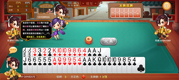 发牌结束后,每方得牌39张,剩余的6张为底牌。在亮主后由庄家取走底牌,而替换成他不需要的同样张数的牌作为新的底牌重新扣下。