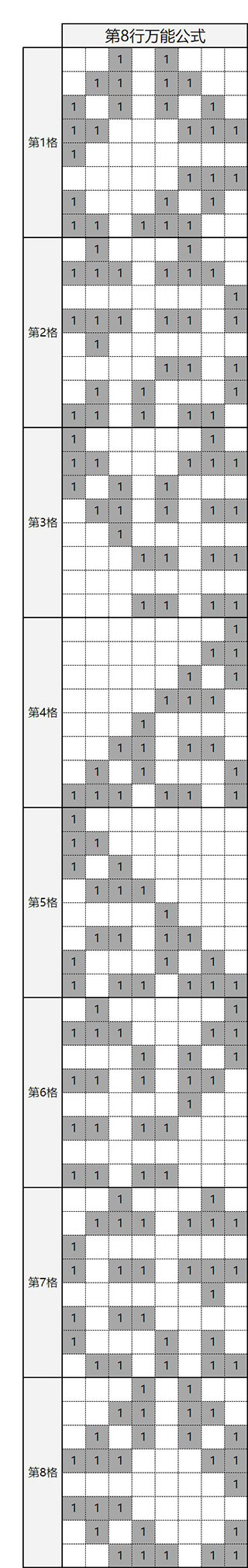 3、根据知乎大佬提供的解法,解译完成了单独翻转第8行1-8格的万能公式(如下图),利用公式求解即可。(例:最后第8行第1格为黑色,目标为第4个格子黑色,那么将1、4的图案想加,按步骤点击即可通关)。