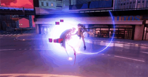 在地面可发动上挑攻击,挑空敌人;在空中可发动一闪攻击可追击敌人并穿到敌人身后。使用一闪需要消耗100点动能(即1格),动能随时间或者在地面攻击命中敌人回复。