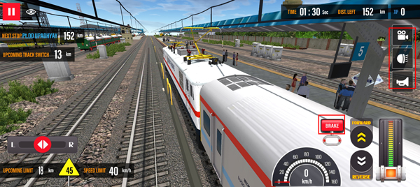 7、当我们需要刹车是,可以拉下右下角的brake按钮,拉动他就可以完成制动,右上角还有切换火车控制视角、喇叭、等按钮,完成游戏的任务获得胜利。