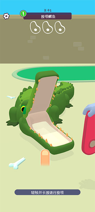 1、打开宠物打工记最新版,进入第一关【投喂鳄鱼】,轻触并长按屏幕拖动肉片到鳄鱼嘴里,即可进行投喂,喂饱3片通关。