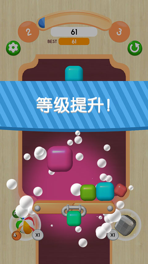 2、两个相同的球球触碰可以合并,并增加上方的进度条,进度条满了后可以获得等级提升。