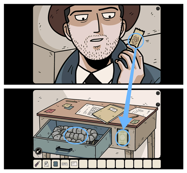 来到客厅触发剧情进入暗室,用砂纸清理墙壁上灰尘获得四个「图形密码」,接着打开左边的柜子拿到「毛刷」和「美工刀」。