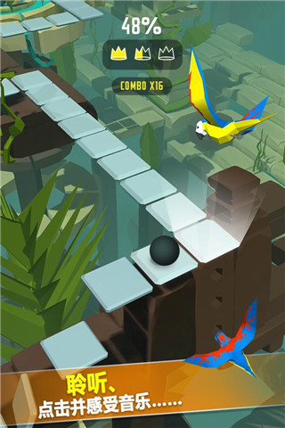 1、多样化关卡——每个关卡都有原创配乐和奇幻场景!2、令人上瘾的节奏型游戏方式——一边聆听音乐、一边点击屏幕躲避障碍物!