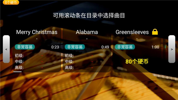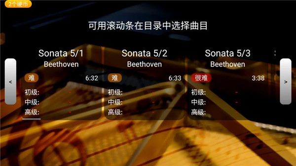 1、游戏开始之前,玩家可以自由设置游戏难度。每首钢琴曲分为三个不同难度,玩家可以自由调整。还可以购买复活卡跟miss卡,以便能更好的完成游戏。