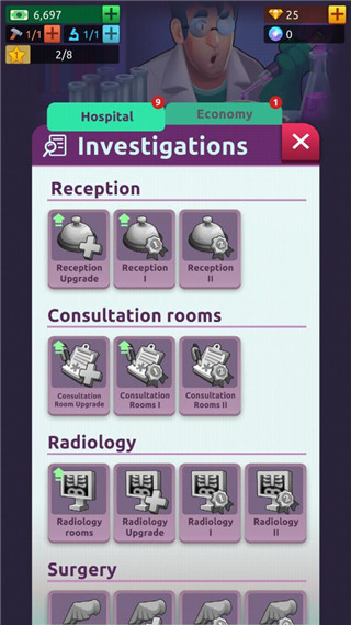 1、【解锁新领域】一个有价值的医院需要实施不同的科室,如放射科、创伤科、医务室、急诊室,甚至是配备齐全的候诊室。当然还有最好的手术室!明智地再投资您的收入,以改善您场所内的所有区域,并快速做出决定,为越来越多的患者提供服务
