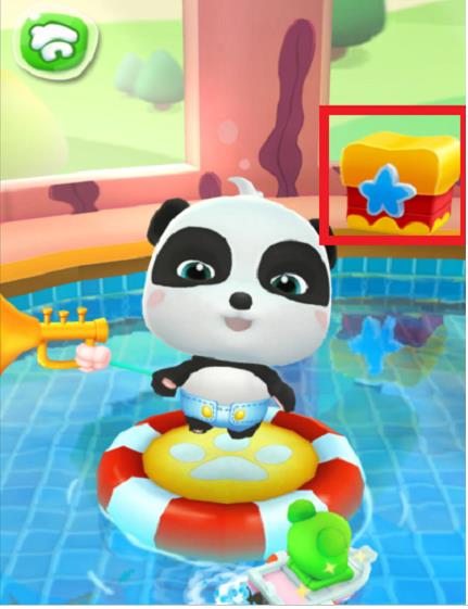 6、奇奇还会吹出喇叭声,轻按池边树旁的五角星礼物盒按钮,就可以进入换套装了