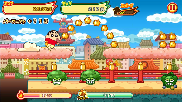 3、深受玩家喜爱的动作闯关游戏,在游戏中玩家需要控制蜡笔小新进行一系列的酷跑闯关,享受游戏带来的刺激。