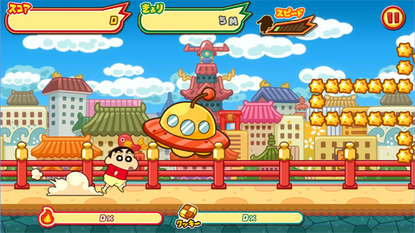这个游戏主要是围绕蜡笔小新和他的春日防卫队成员们设计的跑酷手游。游戏的画面风格很可爱,主要角色野原新之助和其他小伙伴们都有独特的造型,让人感觉特别亲切。操作很简单,玩家只需要通过滑动屏幕来控制小新避开障碍物,还能收集糖果或者击打 UFO 来增加分数。