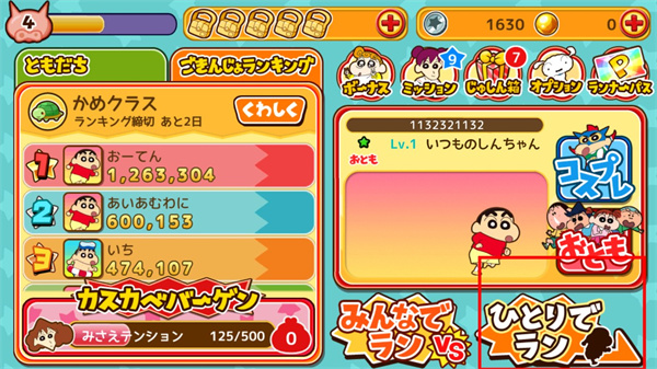 5、最后,当然了除了小新之外,动画片里的其他小伙伴们也会逐一出场。春日幼稚园的风间君、妮妮等朋友如果跟着小新一起跑的话,会产生意想不到的好效果哦,比如进一步提高分数等等。不过想要跟换其他小伙伴也是需要金币的哦!
