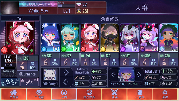 3、在人群中查看您的角色并修改上阵队伍,在此界面可以查看角色属性并升级。