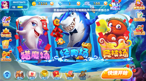 火山捕鱼千炮版福利满满,新注册玩家每天解锁一批指定任务,完成任务可获得话费+永久炮台+各类弹头等奖励,还有每日签到、每日任务活动,轻轻松松获得金币,捕鱼基本无压力!提供经典场、竞技场、狩猎场3大模式,在模式内还有着其它模式爆率玩法,选择进入即可开始点击捕鱼,内置海量鱼种分类,随着你的捕鱼进度解锁更高炮台,等级提升还可以领取道具!