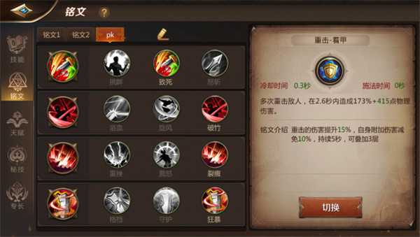 狂暴的就不多说了有钱的玩家可以试试搞两套宝石和装备。红色主打力量副穿透攻击。黄色主耐力副防御(这里的防御以法防位置pvp还是法系打的疼)。蓝色宝石主暴击副格挡韧性,自己看着办。