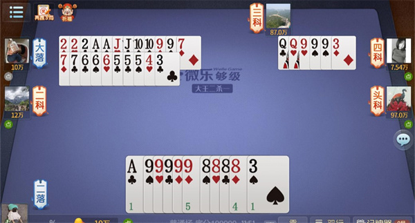 微乐够级手机版是由 家乡互动(厦门)网络科技有限公司推出的一款扑克牌游戏,主要流行于山东地区,它是一种四人对战的牌类游戏,规则与其他游戏如斗地主、桥牌等相似,但也有其独特的特点。游戏中有四副玩法和六副玩法,,分2帮,每张牌的大小、花色、组合方式都会影响胜负。同时,还十分注重队友之间的合作精神,需要相互配合,察言观色,比如送科、保拉、送牌、捎牌等等。