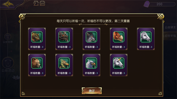 公会祈愿:当玩家加入了公会后,可以前往公会界面——公会活动——祈愿,进入祈愿界面可以选择祈福坐骑魂魄。玩家可以使用一定数量的坐骑魂魄对坐骑进行进阶操作。