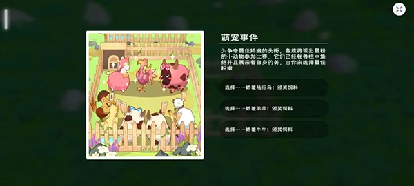 (2)组合事件:饲养对应的动物组合(与图片内的动物有关系但不完全相同)有概率触发,奖励固定(可选)。如下图中,可选娇羞奶牛、娇羞陆行鸟、娇羞羊羊的任意一种,获得对应的宠物之心。