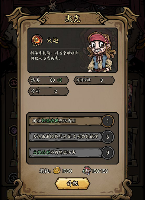 武器为火炮,以单个目标为主,技能可以进行提升,增加炮弹数量和伤害。