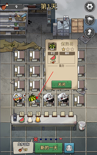 新手的话,可以按照游戏提示一步步来,先选择伙伴,然后看看每天的目标是什么,记得按时生产物资和应对突发事件。游戏操作简单,但策略也很重要,比如合理安排人物技能的触发顺序,或者把能打僵尸的人放在左边优先攻击敌人。