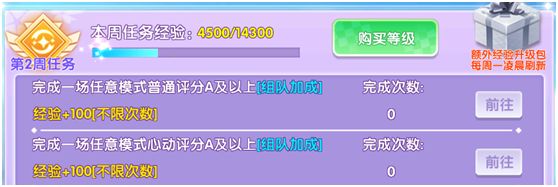 1、舞神--任务:完成每周任务可获得大量任务值,但需注意,本周任务经验值有上限,达到本周上限之后,任务获得的经验值将无法再提升,购买等级、周经验包及其它活动途径获得的经验不受影响。每周一零点解锁新一周任务并终结上一周任务,组队加成的任务中,邀请参与的好友越多,所获得的舞神经验加成也就越高:邀请1名好友可获得10%的加成,邀请2名好友可获得20%的加成,邀请3名好友可获得40%的加成