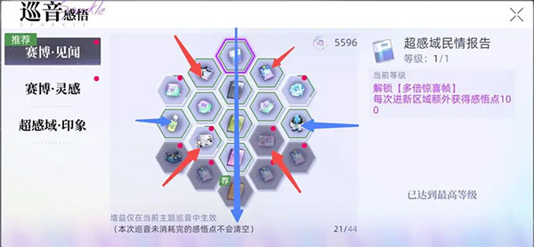 ④巡音感悟有三页,【见闻】和【灵感】需要逐层解锁,详情见上述步骤,【印象】是成就达成的奖励。