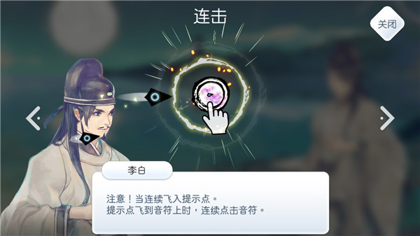 以诗入歌,首创重视歌词互动,将古典诗词融入游戏中,随着音乐节奏点击诗词,或如书法般画出文字,让玩家在游玩中,体会诗词文字之美。在游戏中玩家会按照故事线穿越现代古代,在睡梦中穿越古代,与神秘的诗人相遇,开始剧情挑战。
