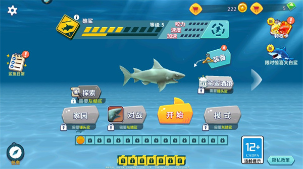 礁鲨满级以后是灰鲸鲨!!就是我现在的,血槽长了,也可以下深一点的水域之中,不过还是吃吃吃吃的攻略。金币够了就赶紧进化咬合力和加速度,只有这些都加满了以后才能进化到下一个鲨鱼!每日登陆那里一定要去领,现在是金币和绿钻交替的,这两个都有解锁鲨鱼品种和技能装备的作用。
