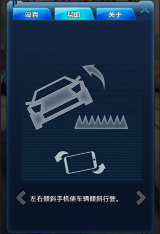 倾斜:左右倾斜手机,可以控制汽车的左右倾斜,躲避地面钉刺障碍、做飞行特技,都会需要倾斜操作。