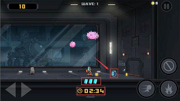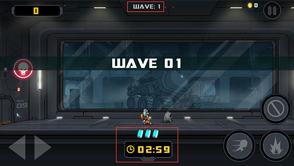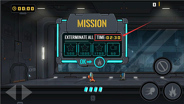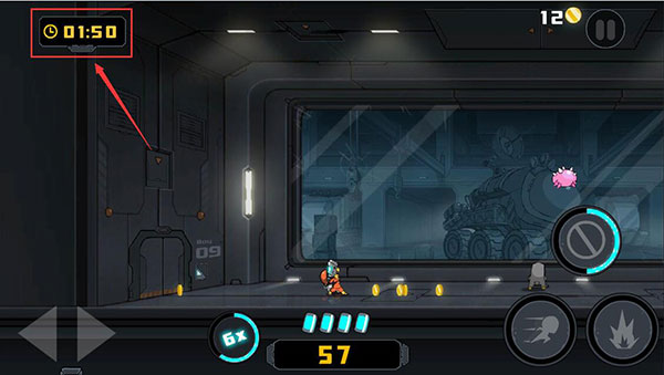 4、左上角显示的是关卡的倒计时,玩家需要在倒计时结束前成功消灭所有敌人。在故事模式中倒计时无法增加,无尽模式中的倒计时可以通过拾取闹钟道具来增加。