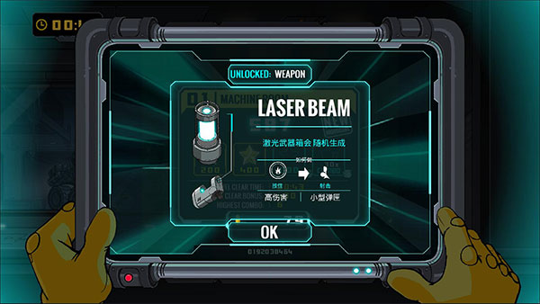 11、胜利通关时,提示我们解锁了新武器,该武器为激光武器,需要通过在关卡内拾取激光武器箱子来获得短暂的使用时间,该武器箱有概率出现在后面的关卡内。