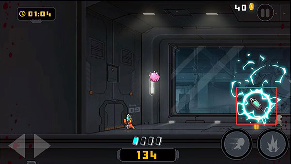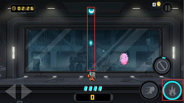 5、左下角控制人物的左右移动,本游戏属于横板射击类,玩家无法跳跃。但可以点击右侧的冲刺按钮进行冲刺,长按的话还可以移动得更远,但有耐力条的限制。