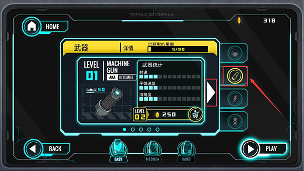 4、武器:目前显示的是武器的各项数据,包括射速、子弹速度、准确度、升级所需金币,点击右侧箭头可以切换其他武器进行购买强化等操作。
