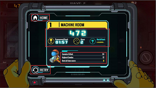 4、无尽模式结束后会显示玩家的游戏分数、生存时间、坚持波数、消灭数量、最高连击数等数据。玩家可以点击RETRY重新开始关卡、HOME返回主界面的操作。