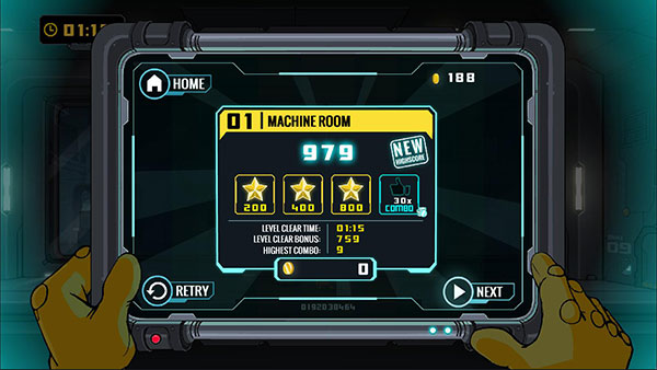 12、关卡的胜利界面显示了玩家的通关时间、目标完成度、游戏分数、连击数、分数记录。玩家可以点击RETRY重新开始关卡、NEXT开启下一关、HOME返回主界面的操作。