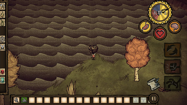 6、游戏就正式开始了,左边是控制角色方向的,右边是收集的,玩家需要收集一切能被利用的资源来躲避饥荒;