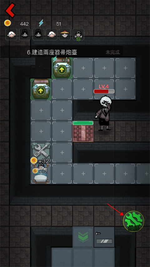 7、当它过来挠3你门的时候可以将门和小床不断的升级,这样即便没有道具它也挠不开,当门被挠了掉血的时候,玩家还可以点击下方维修按钮进行维修;