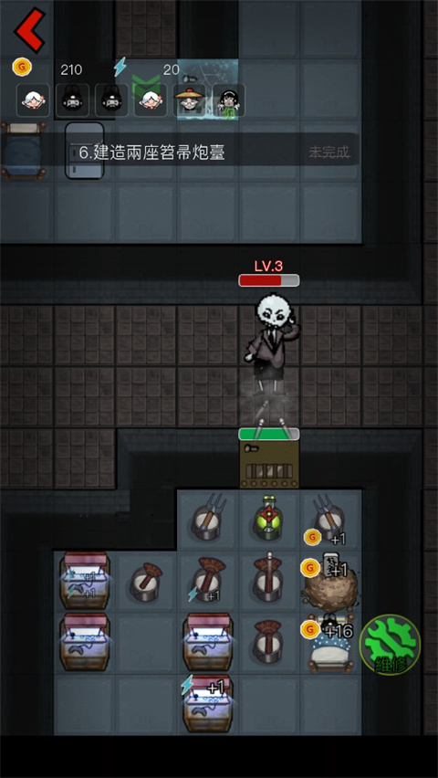 1、前期把矿和游戏机升到满级,在鬼13级时候囤钱和电,后面把矿和游戏机全卖掉给炮台腾地方,可以利用低级矿作为障碍物,其实低级矿产出的钱也没多少,聊胜于无,鬼破除障碍物时间都是一样的,所以什么便宜造什么吧。