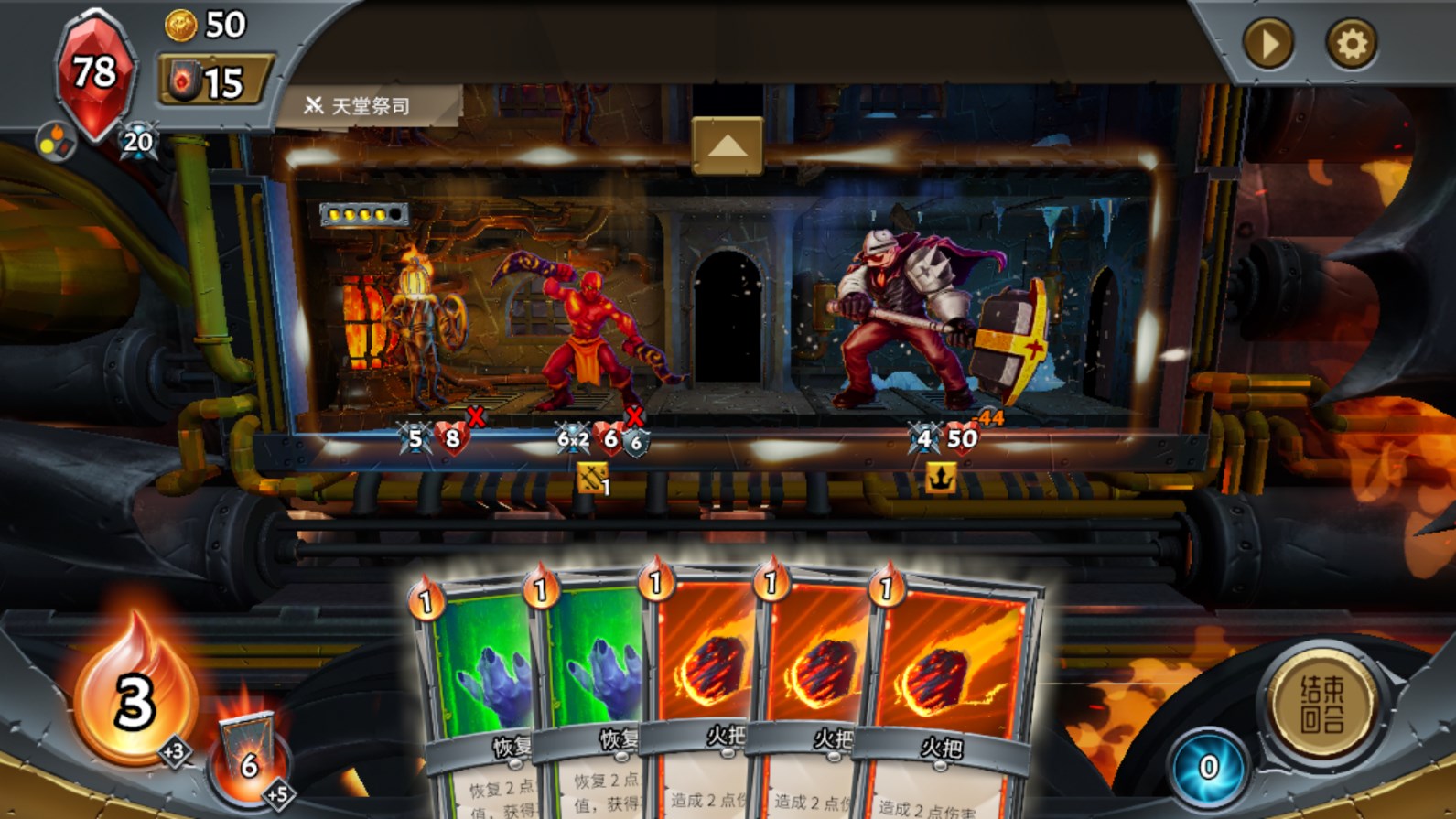 2、当玩家手里的卡牌用完之后,就会随机又出现一些卡牌,就能继续战斗了,要是不知道卡牌的具体效果的话,可以直接点击它,然后它就会放大,就能看到它底下的具体使用方法了,比如火把可以造成五点的伤害,将它拖到五点以下血量的敌人身上,就可以直接将其击败了。