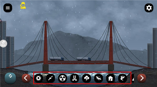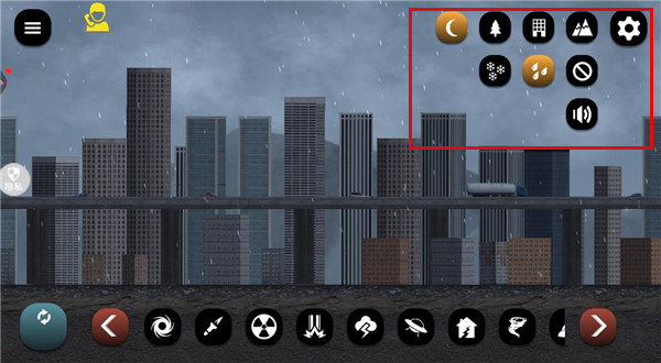 1、打开游戏,可以看到底栏有多种灾害手段,像是龙卷风、核弹、飞碟、地震等等,可以任意选择一种灾害来破坏城市,非常的过瘾