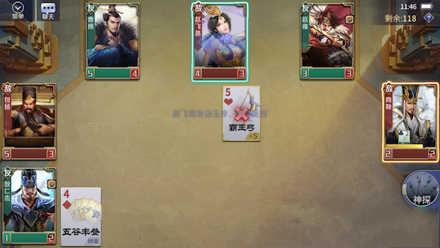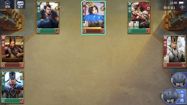 闯关中可以分为防御型和攻击型两种。防御的话就给她戴上图强、玉如意和轻灵等印记,再加上手上的闪就可以多次进行额外摸牌,图中的boss很难打掉我们的血量;攻击型则尽量要使用烽火或者万箭印记,再配上刘邦换牌的技能,每回合摸牌然后进行驭人换牌,很快就会刷到虎符等强力攻击武器,过关将会非常简单。