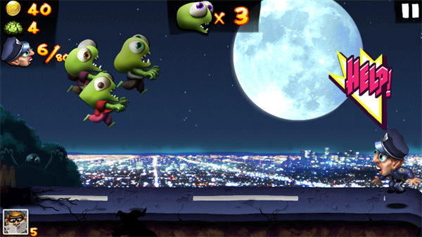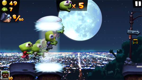 在僵尸尖叫中,玩家不需要控制僵尸的左右移动,玩家可以点击屏幕,让僵尸跳起来,当玩家单击一下则僵尸会跳跃起来,当用户长按屏幕,僵尸便会在跳跃到一定高度后,以一种滑行的姿态在空中滑翔一段路程