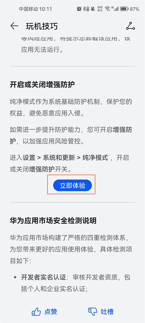 2、点击后会跳转到玩机技巧中,在下方找到立即体验按钮并进入。