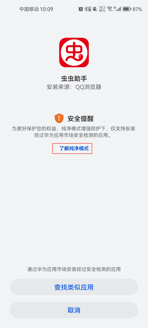 1、下载好ccplaycom虫虫助手,点开安装页面提示无法安装,点击了解纯净模式。