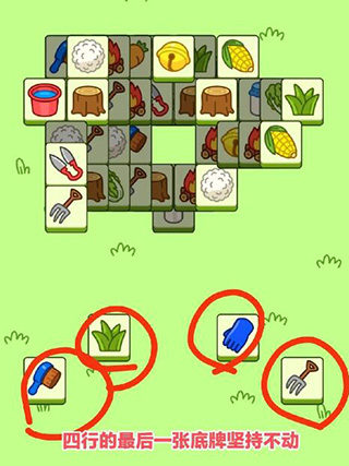 四行的最后一张牌翻出来之后,主要消上面大块的牌而且你最好保证,一个道具都不用,为什么要留下四行的最后一张牌呢?大家都知道道具第-格的用处是抽出三格摆上去,要用的时候就可以直接取用,相当于你原本七格的空间多了三格备用格,而那四行的最后一张牌也一样是备用格;
