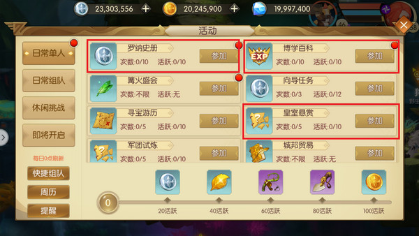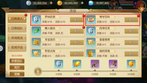 4、在18-30级时日常单人活动中主要增加经验的活动有:罗纳史册、城邦任务、皇室悬赏和博学百科。如果需要快速提升等级,每日完成活动必不可少,需要注意的是有些活动是限定时间的,例如博学百科,玩家们需要在特定时间段参加活动。另外其他的活动也是可以拿到少量经验和其他的活动道具。