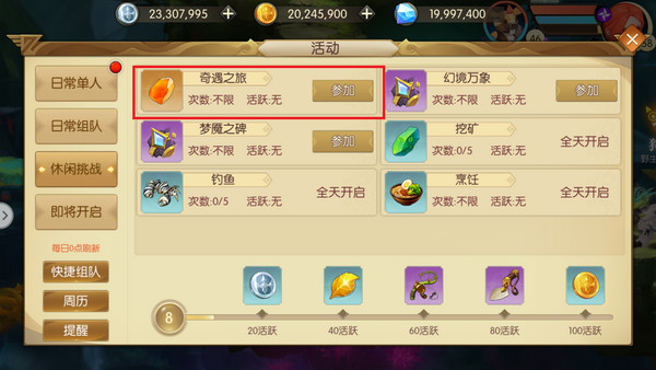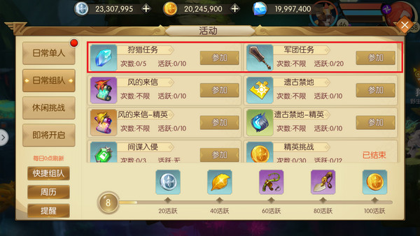 5、每日挑战和日常组队任务中主要增加经验的活动有:奇遇之旅、狩猎任务和军团任务玩家可以在活动获得较多经验。随着等级的提升,活动会开启更多,玩家会有更多经验活动可以参加。