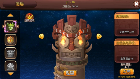 在图腾界面里,点击右下方的点亮按钮,即可进行图腾升级,,并且按住点亮按钮后,游戏就会自动消耗星星与石币,持续进行点亮。