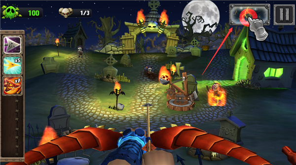 6、之后游戏中会出现骷髅,按住屏幕移动瞄准骷髅放手即可发射,点击左边的弓箭还可以切换其他的弓箭;