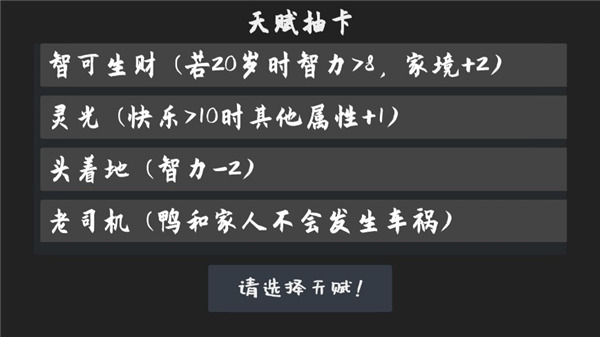 游戏当中会有各种有趣的情节触发,鸭的结局等你来逐一的体验的。同时在鸭的一生游戏当中玩家可以感受到各种精彩的内容玩法,自由的去进行各种天赋来选择来开启一段精彩的人生。喜欢的玩家还在等什么,快来下载体验一下试试看吧!