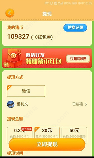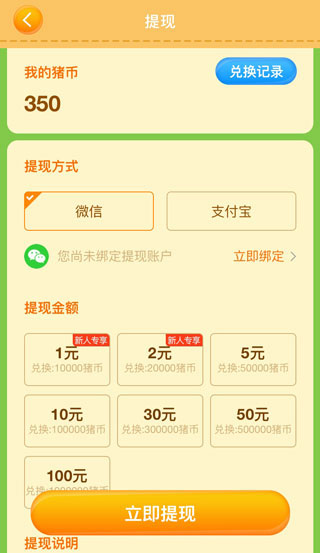 经过你不断的努力,也赚到一些猪币了,淘到一些金子了,想要提取出来,等你提现的时候,你会发现,不是你想要提出多少就是多少(新手会有一个0.3元的提现体验金),你必须达到他们规定的金额才能提现。