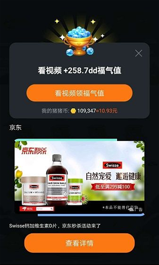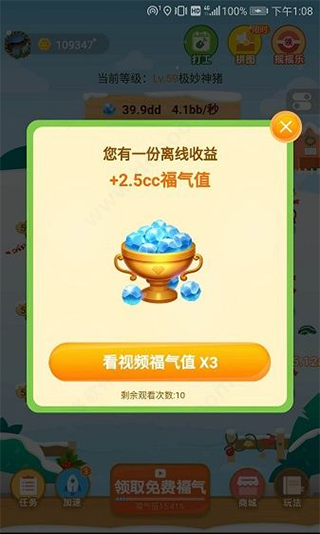 此外还有任务,领取猪币,随机领取奖励值,但想要获取翻倍值都只能通过一个条件,那就是看广告。
